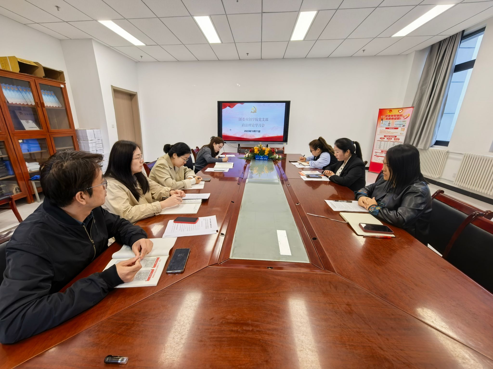 为深入学习贯彻习近平新时代中国特色社会主义思想和党的二十大精神,切实将支部党员的思想与行动统一到党中央决策部署上来,2025年10月11日15:00,中共咸阳职院团委双创学院党支部委员会在教学楼⑧925会议室,组织召开了政治理论学习会议,支部全体党员参会,会议由滑娟主持。
